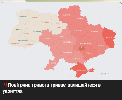 Воздушная тревога в Украине остается. В большинстве регионов небезопасно. Все находитесь в укрытии. Карта воздушных тревог выглядит так: