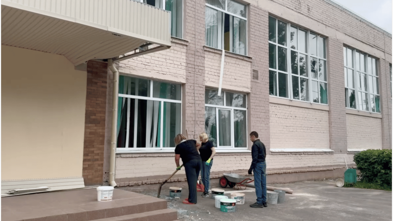 Коммунальные службы и работники школы работают над ликвидацией последствий российского удара. Они приводят территорию в порядок.