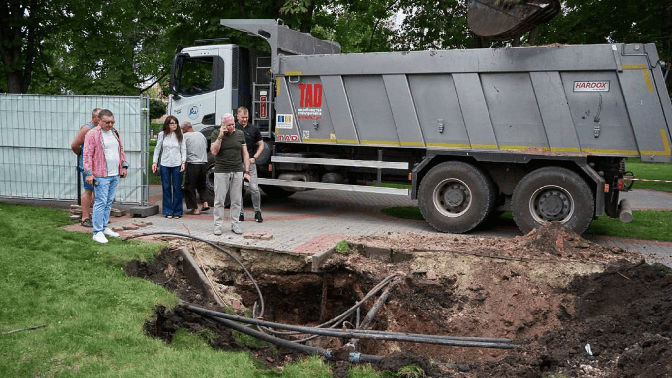 "Утворився такий провал, який у сквері "Стрілка". Ми зараз будемо розкопувати, ми долучили сюди краєзнавців харківських, істориків для того, щоб вони оцінили, що це таке, бо тут прокладені підземні комунікації", — розповів Терехов.