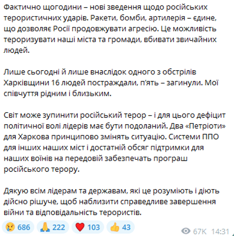 "Світ може зупинити російський терор — і для цього дефіцит політичної волі лідерів має бути подоланий. Два "Петріоти" для Харкова принципово змінять ситуацію. Системи ППО для інших наших міст і достатній обсяг підтримки для наших воїнів на передовій забезпечать програш російського терору", — додав глава держави.